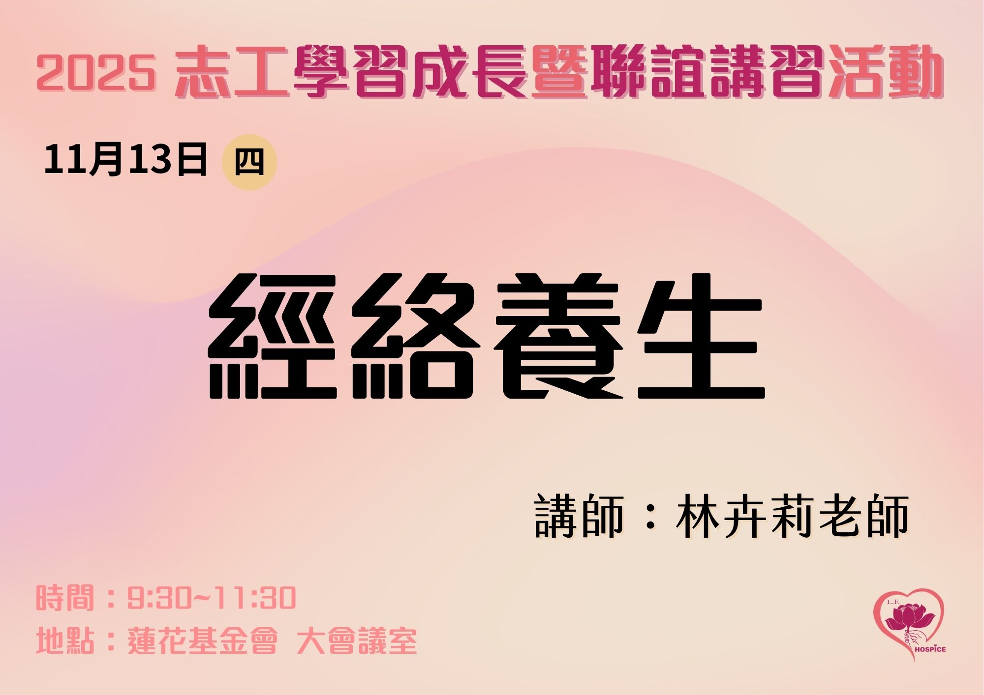 蓮花基金會主辦2025年志工學習成長暨聯誼講習活動,本系列共有7個場次。本課程為11月份場次。