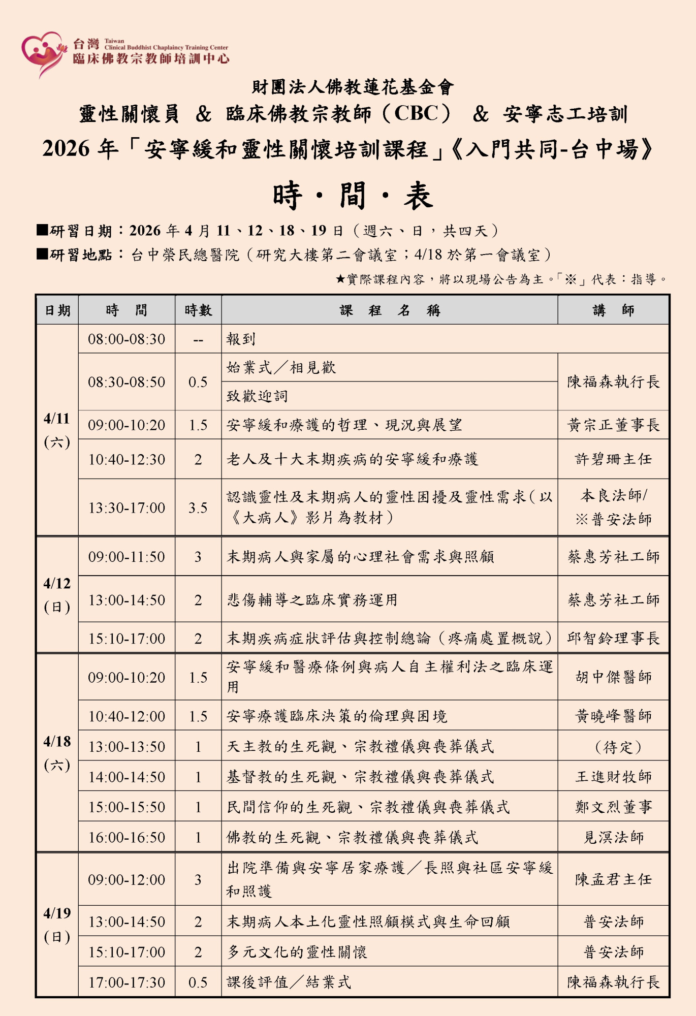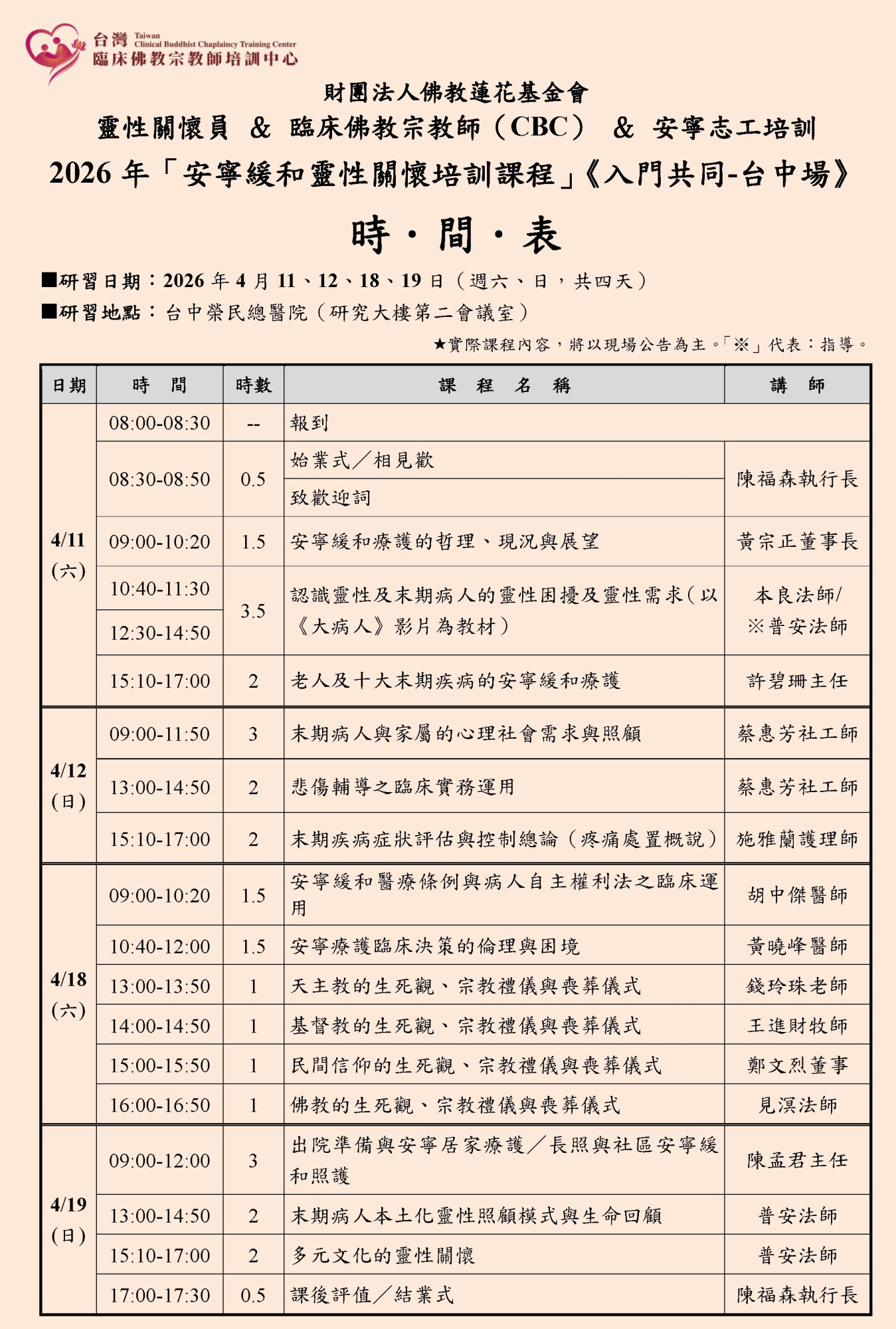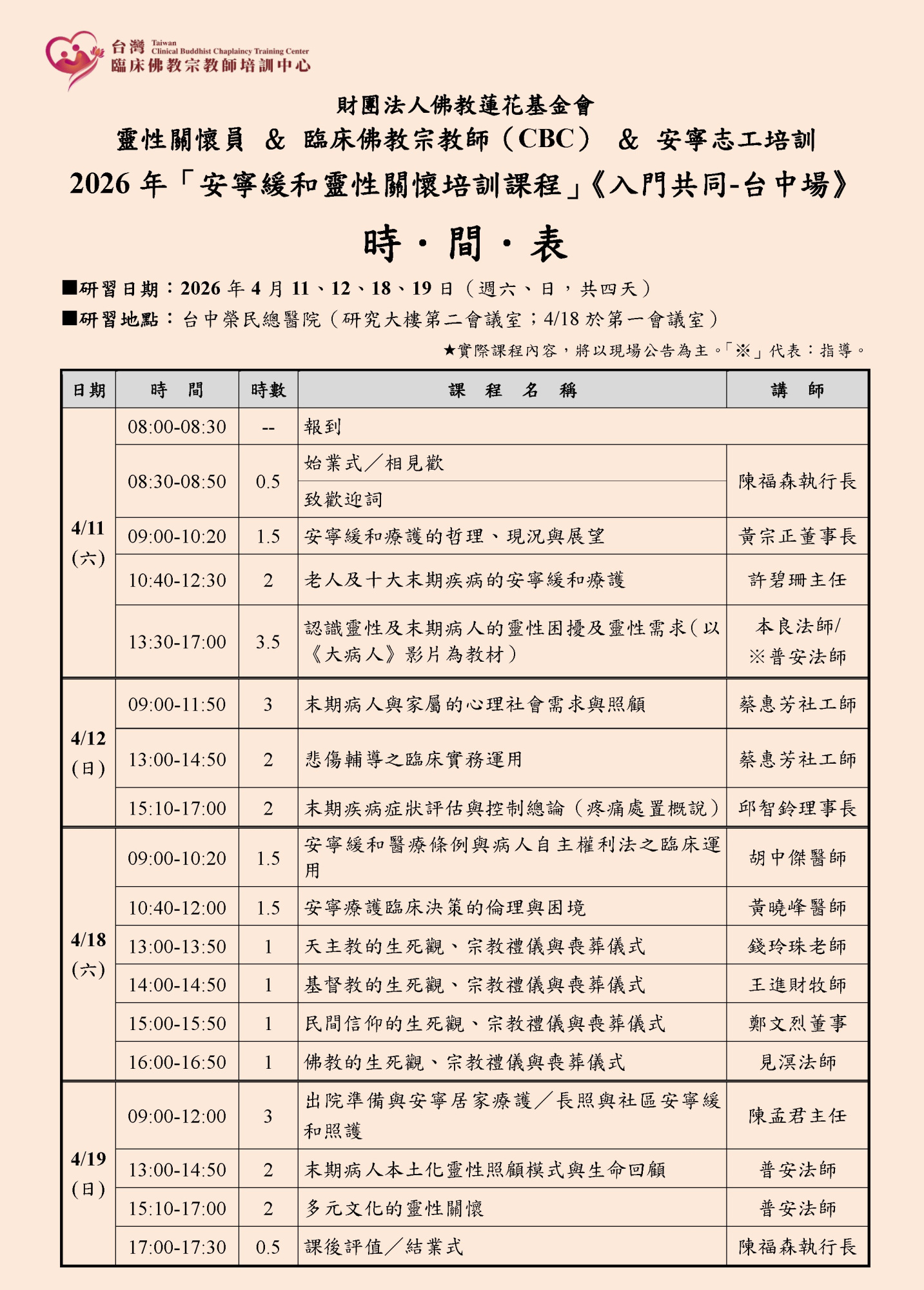 - 本課程符合「安寧乙類醫護教育訓練基礎課程」,以及「安寧靈性關懷人員培訓與民間宣導推廣計畫」之課綱時數與內容。