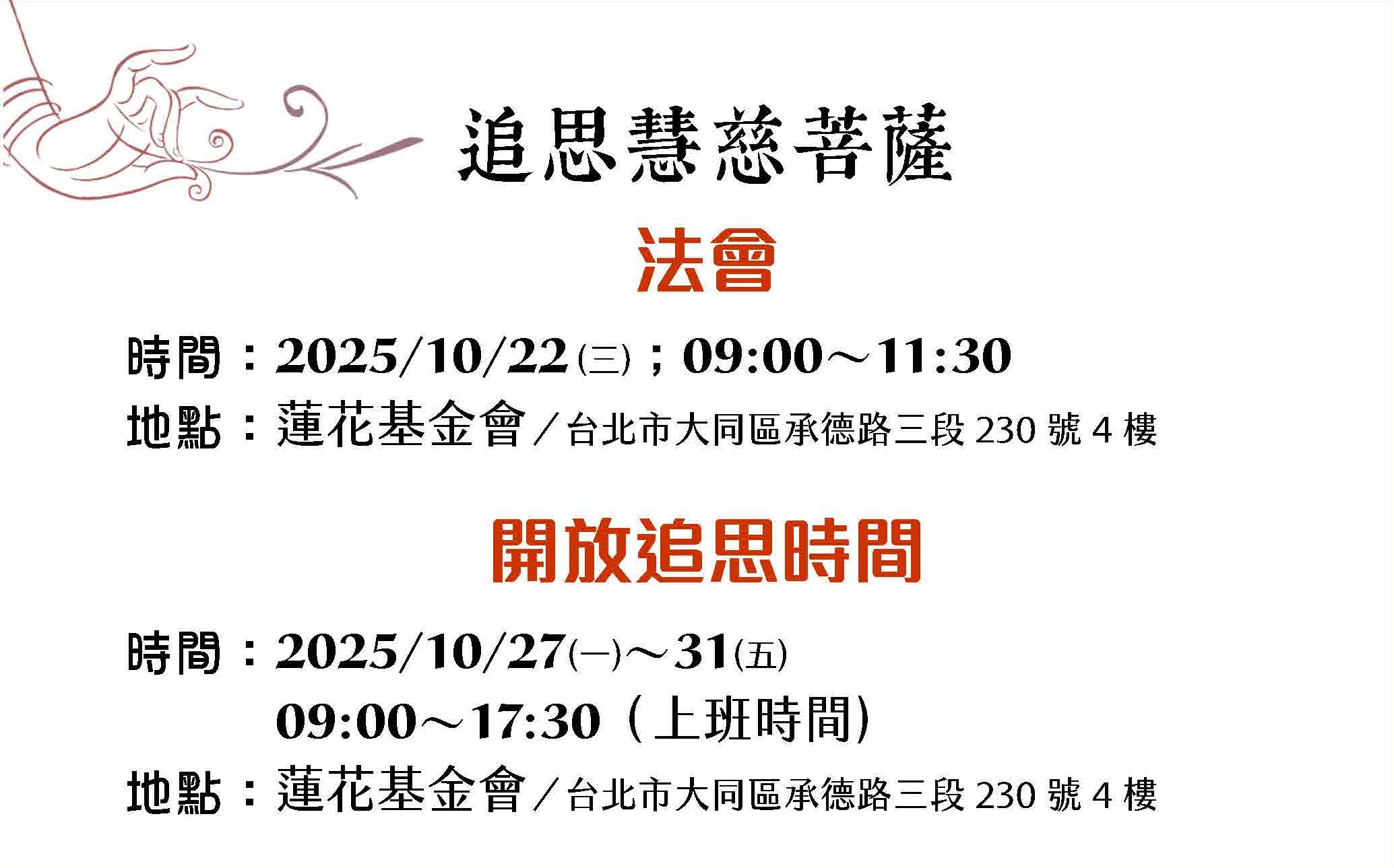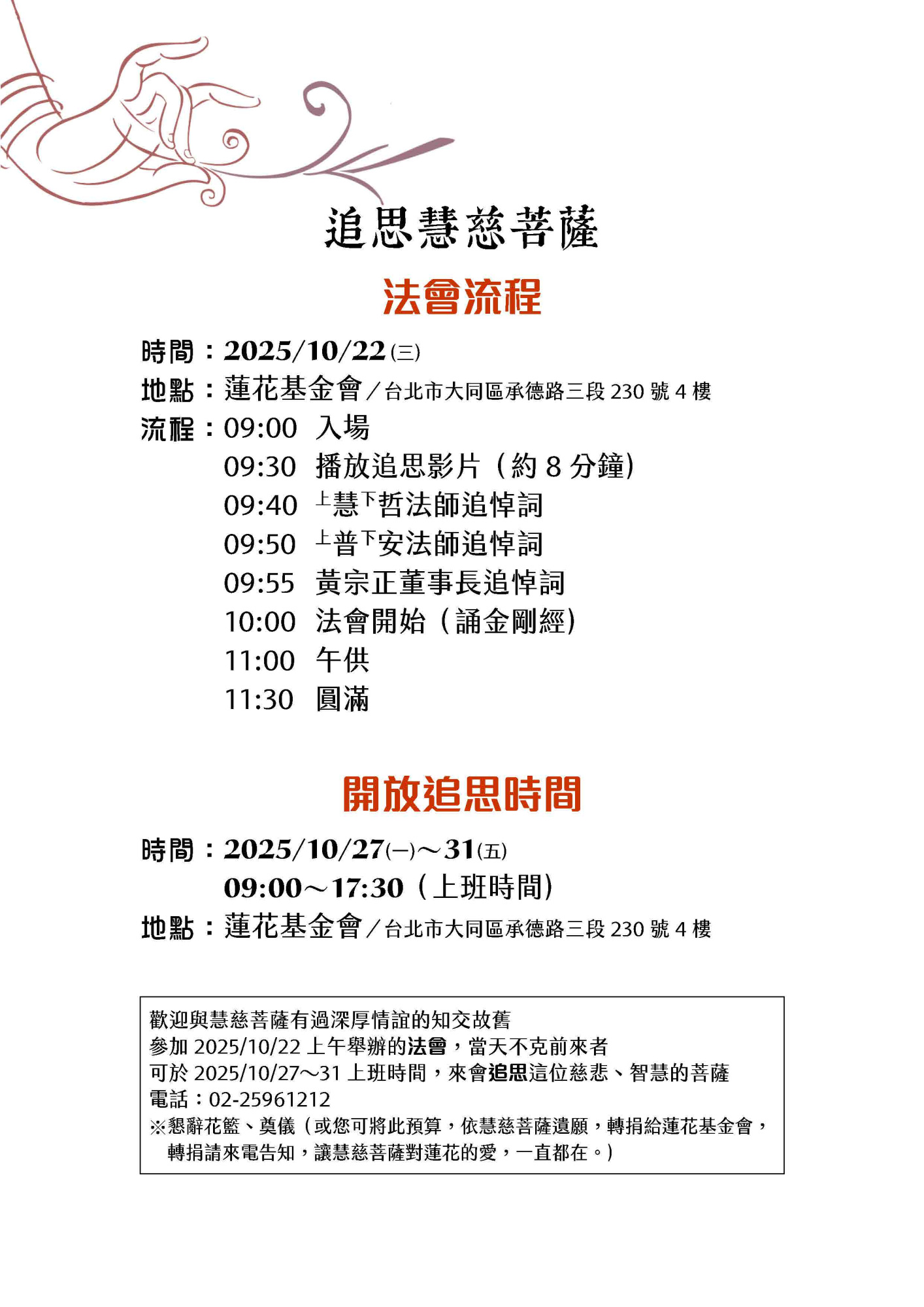 我們敬愛的蓮花大姊 陳慧慈執行顧問,已於2025/10/20;13:00左右往生西方極樂淨土,歡迎與慧慈菩薩有過深厚情誼的知交故舊,一起來為慧慈菩薩祈願祝福。
