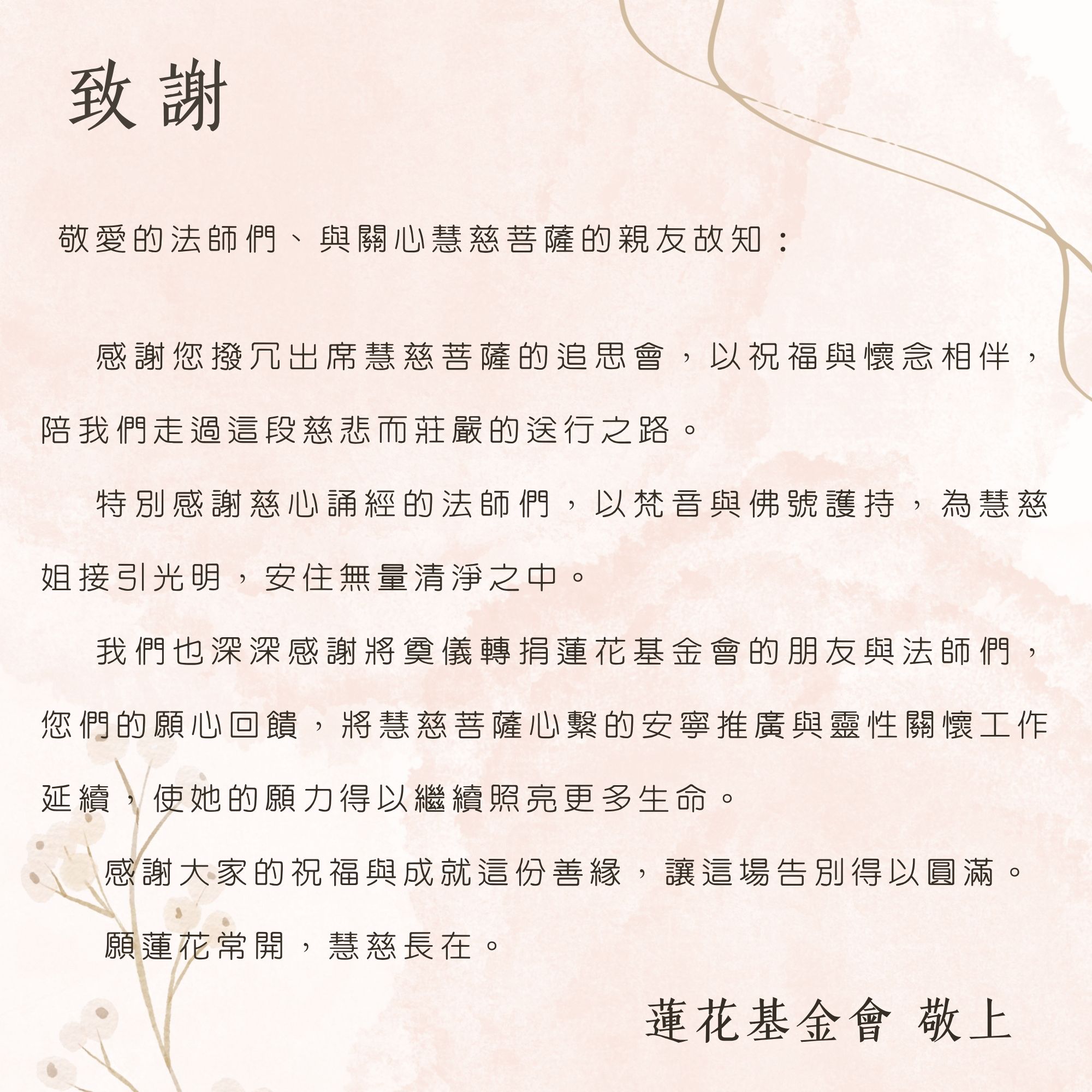 我們摯愛的蓮花大姊,陳慧慈執行顧問,已於2025年10月20日下午1點左右,安詳往生。
