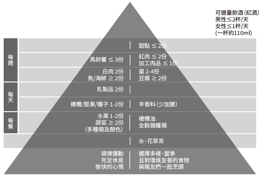 陳乃嘉營養師更進一步表示,地中海飲食中所推廣的,豐富的植物性食物(蔬菜、水果、堅果種子、豆類及未加工的穀物),利用橄欖油烹調,多選擇魚類及海鮮,適量食用蛋、家禽及乳製品;少加工食品、紅肉及甜點,不僅抗發炎亦有利於腸道菌相的健康,且在飲食金字塔最底層,也提供促進身心健康的生活型態建議,如規律運動、充足休息、保持愉快的心情,和選擇多樣化、當季對環境友善的食物與親友們一起烹調,都是很平易近人、且能長久執行的健康飲食態度。