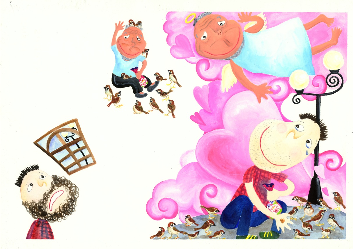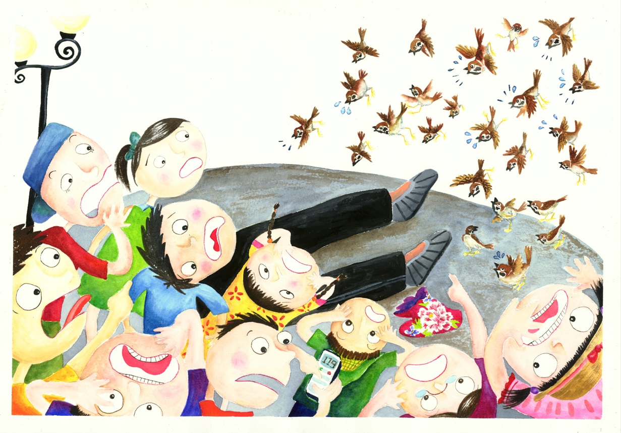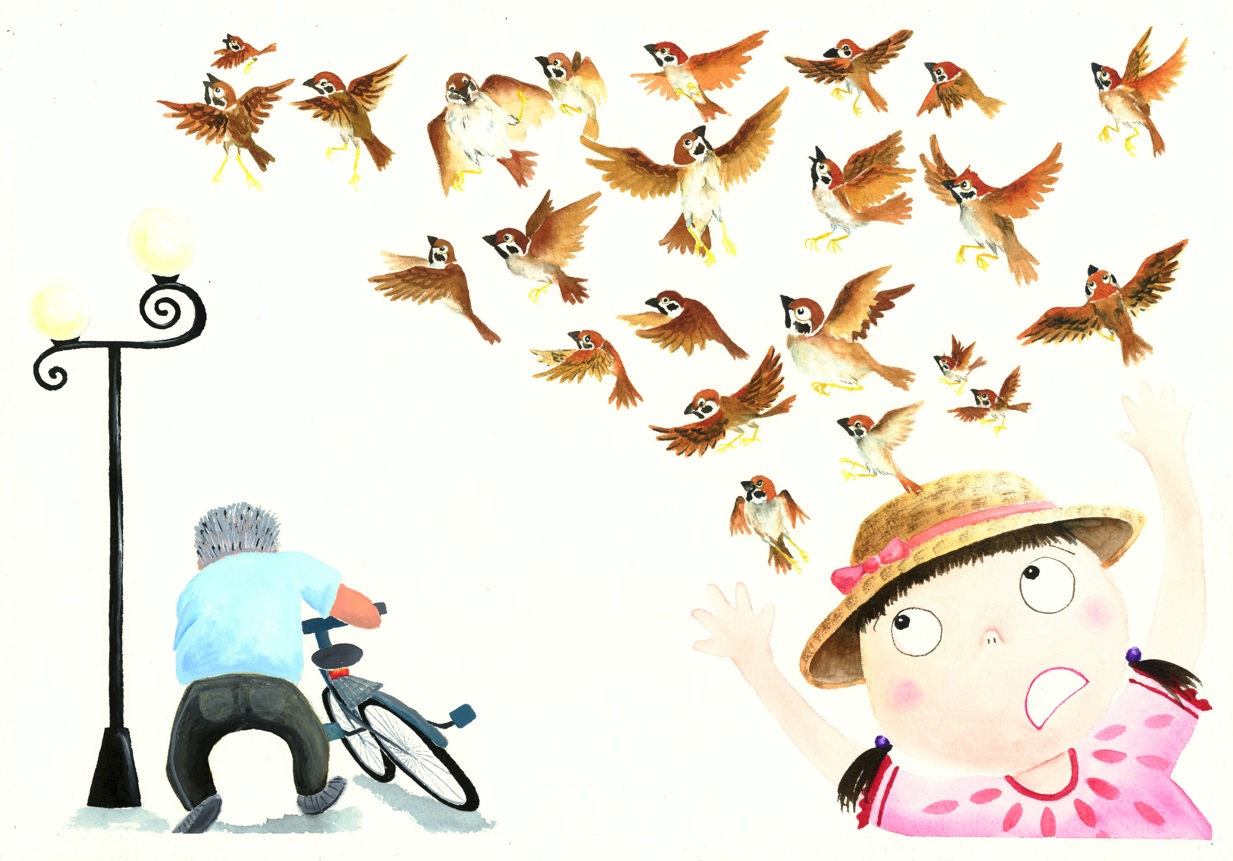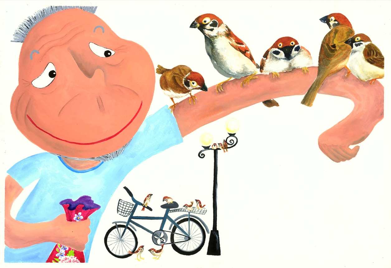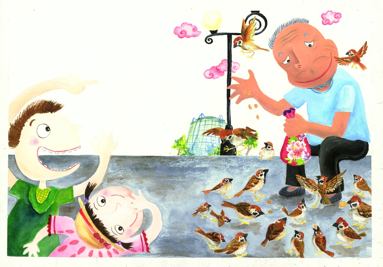 故事簡介:廣場上,麻雀爺爺一出現,麻雀便飛上飛下啄食他灑下的麵包屑。餵完後,他推著單車離去,麻雀也四散。過去住鄉下時,他養雞鴨鵝,日子快樂,卻在八十歲前夕中風,被兒子接到都市。身子稍好,他常去廣場餵麻雀,彷彿牠們懂得他的思鄉。傍晚成了慰藉。但某天他又在廣場中風,兒子驚呼:「你快好起來呀!」團圓夜裡,他勉力將紅包交給最愛的金孫,不久便離世。兒子看著照片,滿是矛盾卻也連結著親情。廣場上,依舊有麻雀與餵食的身影。