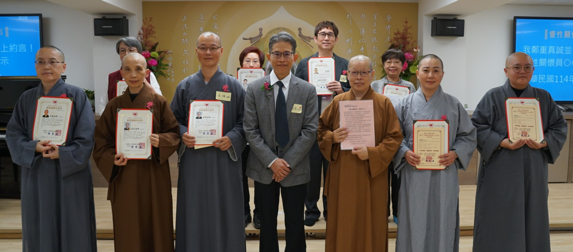 歲末感恩音樂會中臨床佛教宗教師與靈性關懷員的授證典禮,見證了一段長達兩年的學習歷程,也為多位完成嚴謹訓練的宗教師與靈性關懷員,正式開啟臨床與社區服務的新階段。這不僅是一場授證儀式,更是一群人選擇走進生命最脆弱時刻、願意陪伴他人走過終程的承諾。