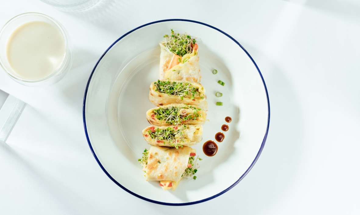 三日苗25g、雞蛋1 顆、蛋餅皮1 張、起司2 片、彩椒1/2 顆、醬油少許