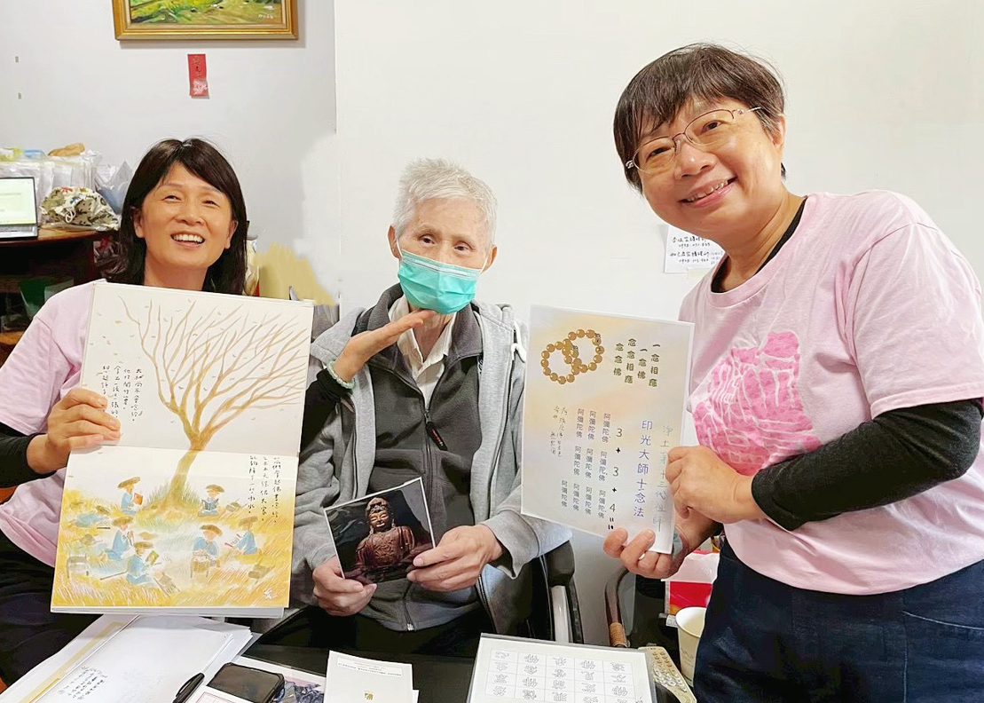 輕度失智讓李爸爸常常想說卻說不出口。一次訪視結束前,我主動拿出繪本說要講故事給大家聽。他輕撫封面,念出書名《雨》,像孩子般好奇觸碰畫中的天空與人物。故事描述,小和尚每日寫下「雨」字以安定心神,終至感動天地。聽完,他說故事很好。我鼓勵他也可以像小和尚一樣,每天寫一個字、一句話,累積一點點進步。他點頭合掌,拿起筆寫下「阿彌陀佛」。對衰弱長者而言,繪本成為互動的橋梁,帶來共鳴,也產生關係的連結感。離去時,他努力扶著助行器站起身,目送揮手道別。那一刻,我感受到他像一位慈祥暖心的老師,用生命教導我們。