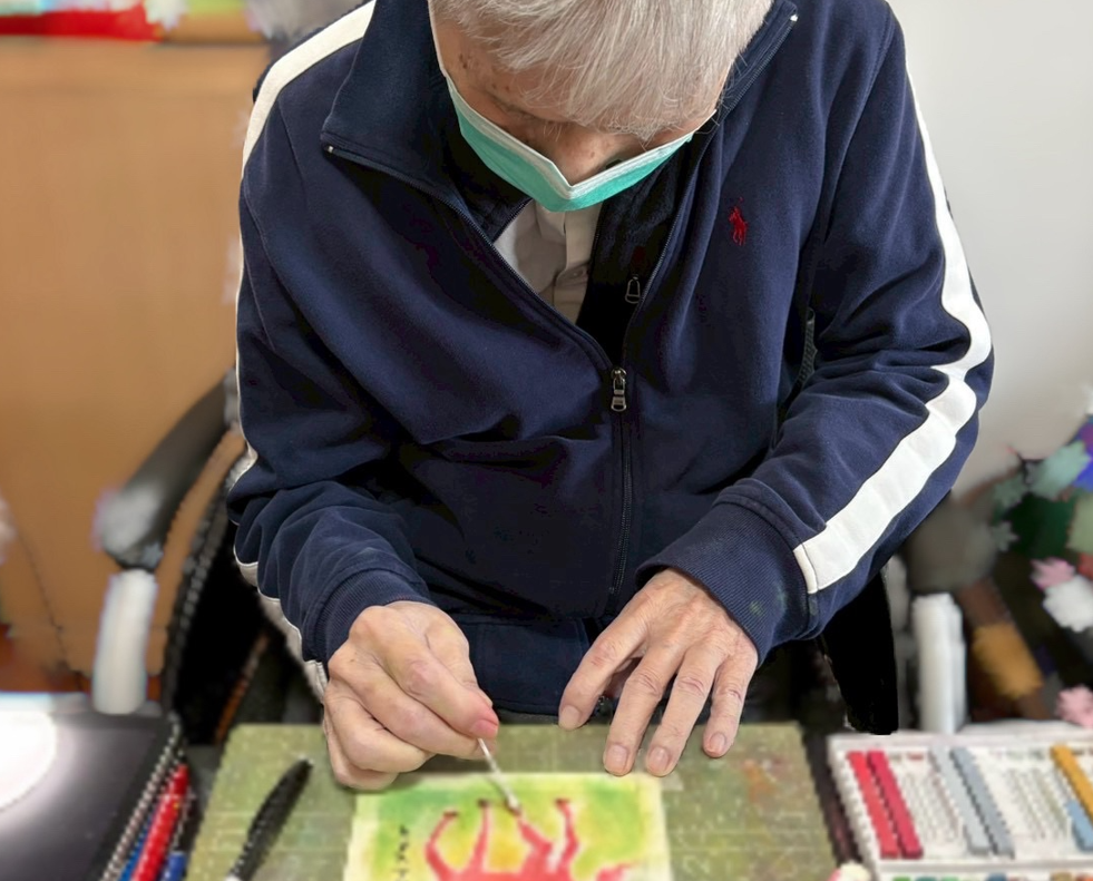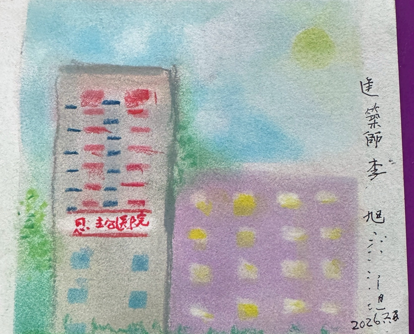 年終時,我以和諧粉彩陪伴他表達願望。他將塗抹的七彩餅乾一一獻給家人、志工與醫護團隊, 簽名做成賀卡以表達感謝。一次回顧人生時得知他參與興建醫院工程,我協助剪出建築物型版,即使身體虛弱,他仍能專注細心為醫院外觀窗戶塗色,似乎找回從前繪圖的感覺,眼神閃亮地說:「這是我畫的、我蓋的醫院。」指尖觸覺與粉彩視覺跨越聽覺障礙,李爸爸光榮與成就重新被看見,他反覆端詳作品,連聲說「讚」,並說要傳圖給上司陳院長看。迎接農曆馬年,他又畫下一匹紅馬並親筆題字,眾人掌聲圍繞,我在他純真的笑容裡,看見一扇心靈之窗緩緩開啟。